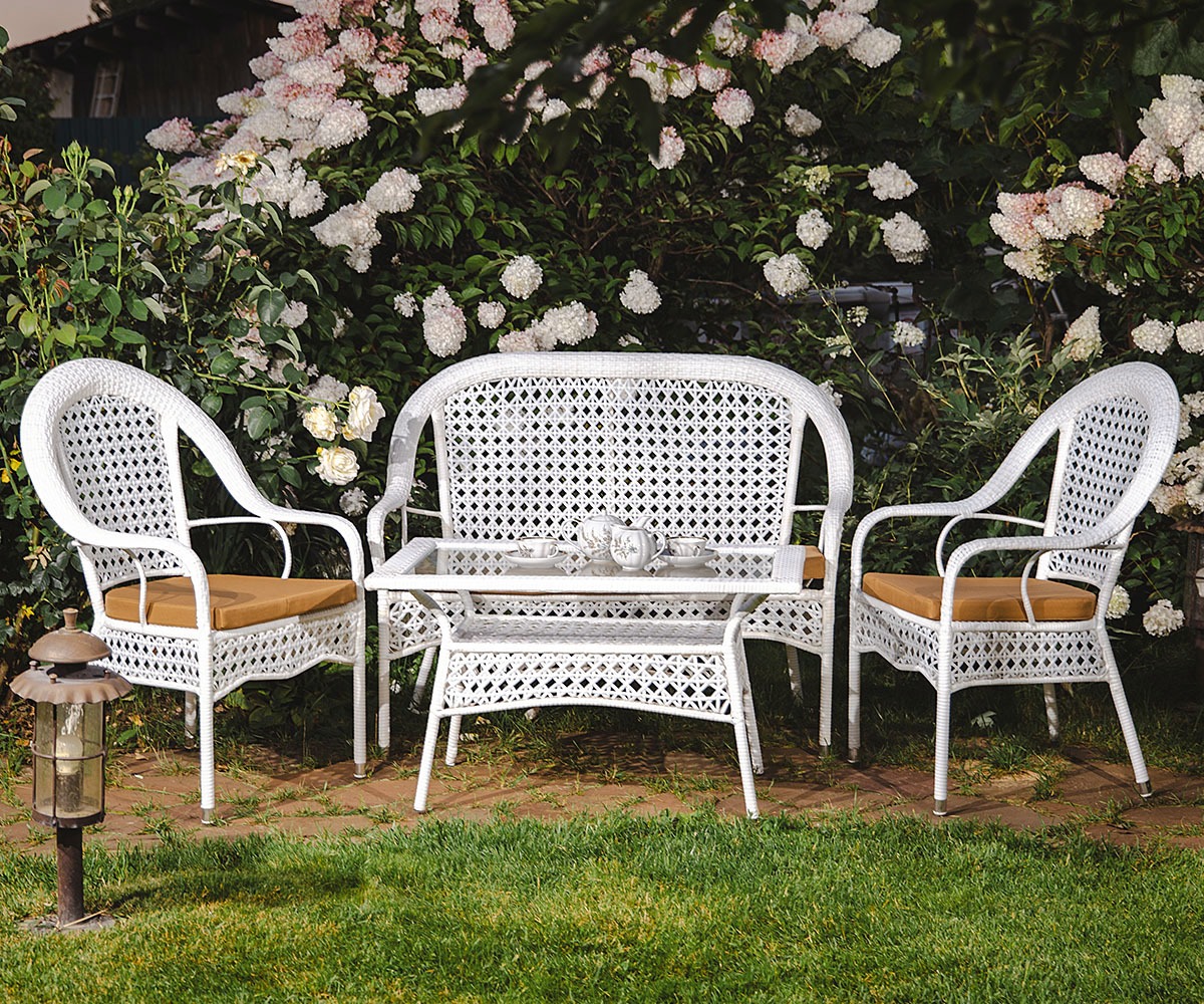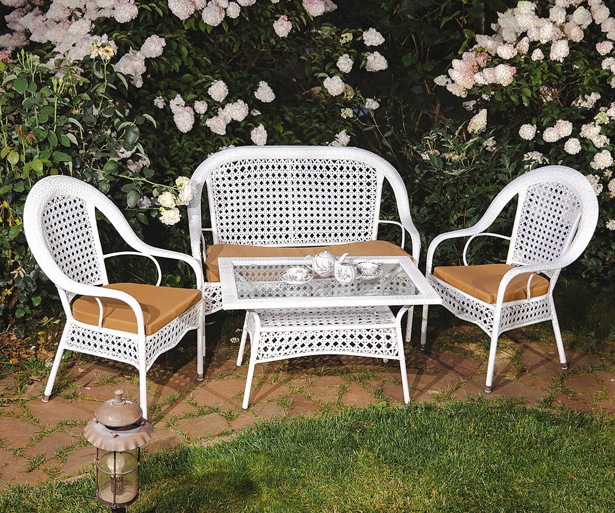 Комплект мебели Шампань отличается утонченным французским стилем и изысканностью. Сетчатое плетение ротанга эластично, принимает форму тела, поэтому сидеть на нём комфортно в жаркую погоду и без подушек. Благодаря своей эргономике кресла и диваны Шампань удобны для людей любой комплекции. Комплект мебели Шампань украсит собой веранду или садовую беседку.