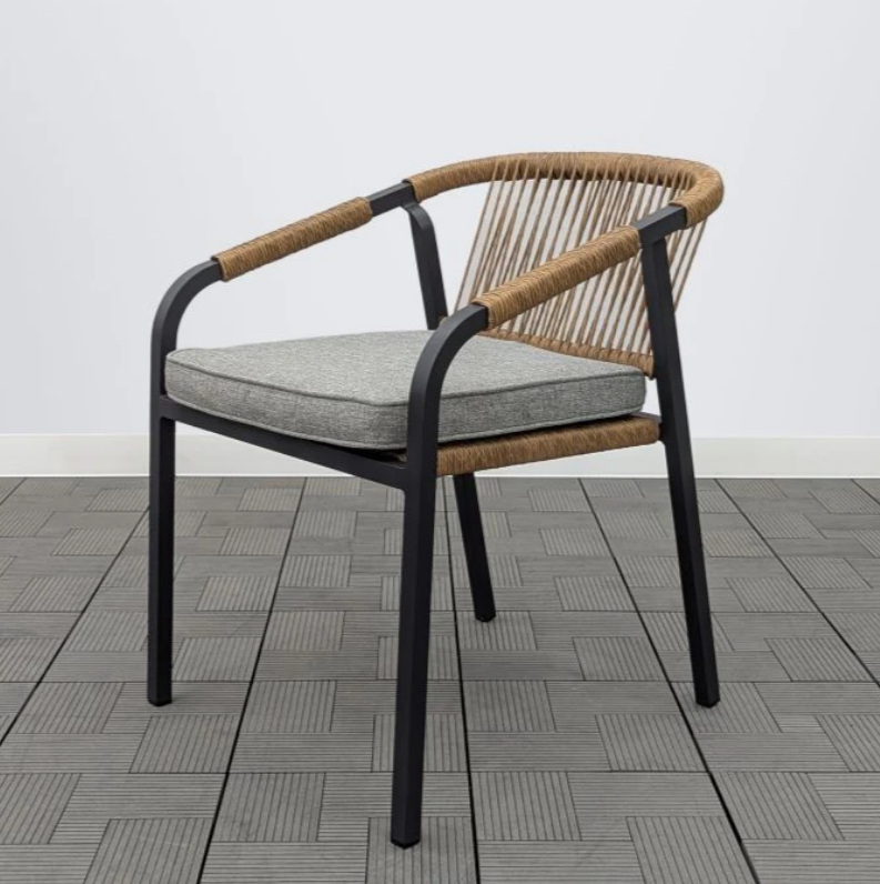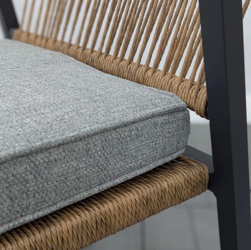 Комплект мебели обеденный BRNO представляет собой идеальное сочетание современного дизайна и комфорта. Его каркас выполнен в элегантном оттенке антрацит, что придает мебели сдержанную строгость и стиль. Жгут бежевого цвета мягко контрастирует с темным каркасом, создавая гармоничное визуальное восприятие. Светло-серая подушка, обивающая кресла, добавляет нотку уюта и является прекрасным акцентом в общей палитре.