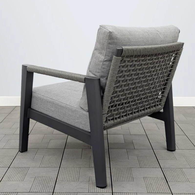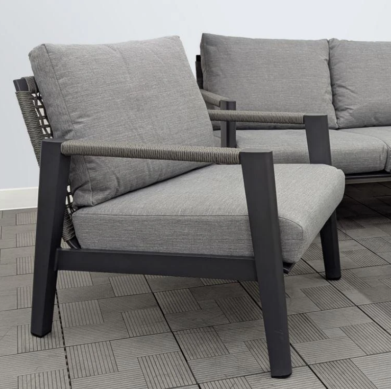 Каркас этой мебели выполнен в антрацитовых оттенках, что подчеркивает современный дух коллекции и делает её универсальной для любого интерьера. Стол с алюминиевым каркасом в цвете антрацит идеально дополняет ансамбль, выполненный в том же стильном тоне, создавая гармоничный и согласованный вид.